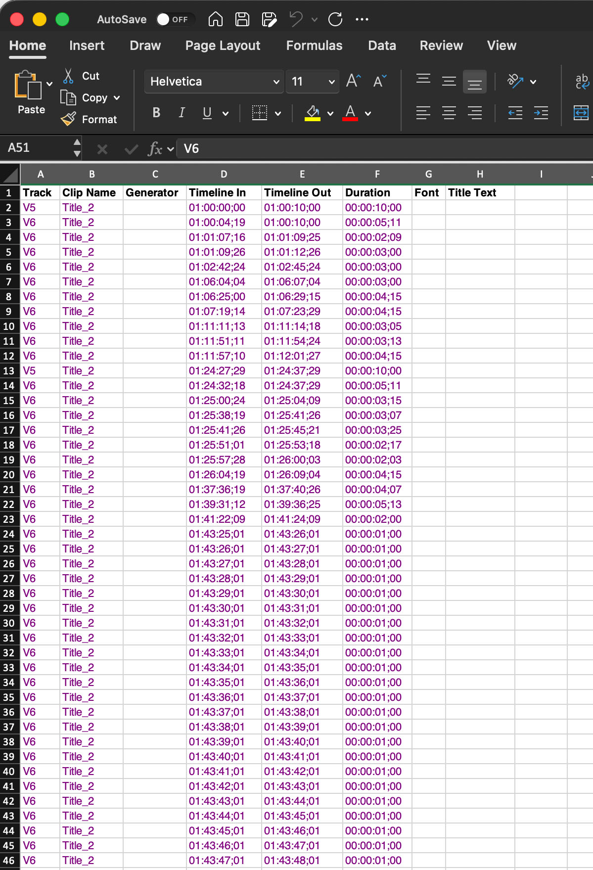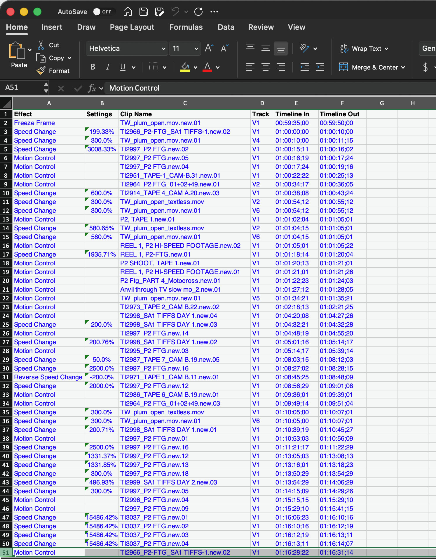 Lists the Motion tab settings applied to video clips for the chosen tracks. The report includes columns for: Track; Motion setting name; Clip Name; Sequence In timecode; Sequence Out timecode; and Duration.